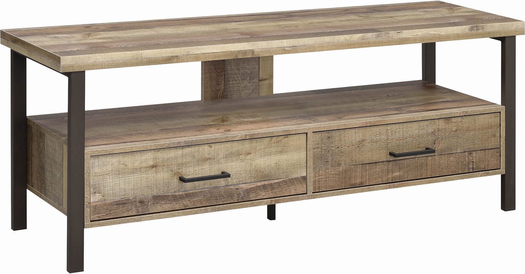 With its clean lines, black metal hardware, and warm wood finish, the Rustic Weathered Pine 60" TV Console offers a simple, classic look to complement almost any home. Two drawers and a middle shelf provide storage for blankets, toys, movies, and gaming equipment plus ample room to dress up your space with decorative accents. This piece supports a television up to 60" and 110 pounds.